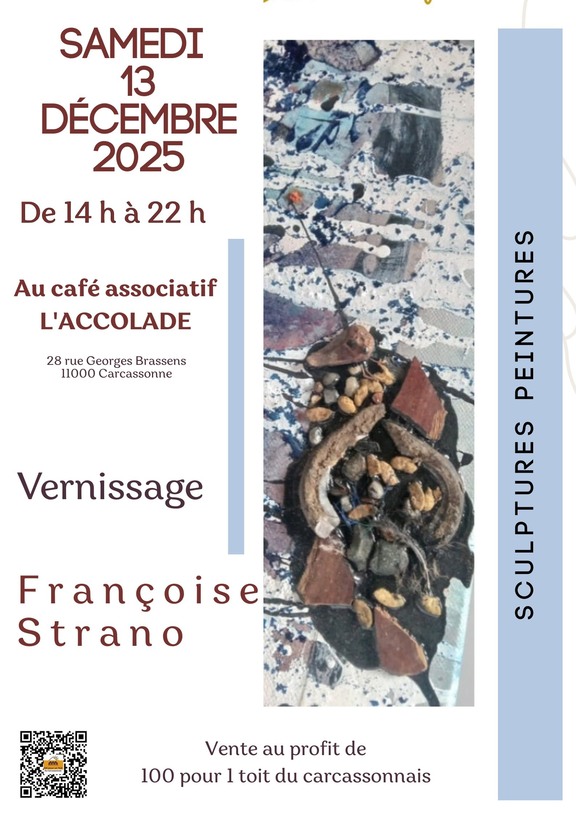 Les membres de l'association 100 pour 1 Toit du Carcassonnais vous invitent à l'exposition-vente d'une sélection d'œuvres de Françoise STRANO le samedi 13 décembre à partir de 14h00 au Café associatif L'ACCOLADE, 28 rue Georges Brassens.